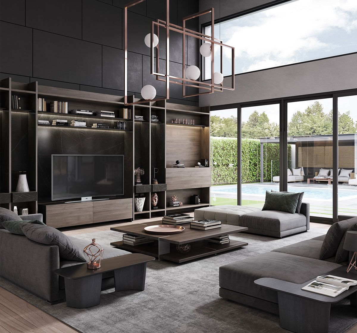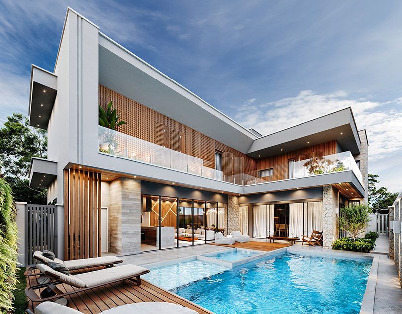 Các thiết kế biệt thự hiện đại 2025 thường mở rộng tối đa tầm nhìn với hệ cửa kính lớn, sân vườn liên tiếp trực tiếp với phòng khách, bếp và hồ bơi. Đây là cách tạo ra trải nghiệm sống gần gũi thiên nhiên mà vẫn đảm bảo riêng tư.