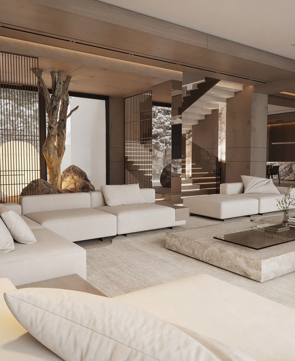 Không còn là sự phô trương vật liệu đắt tiền, biệt thự năm 2025 ưu tiên nét đẹp tinh tế, sử dụng chất liệu tự nhiên như đá marble, gỗ walnut, vải linen cao cấp… kết hợp bảng màu trung tính (nâu nhạt, be, xám lạnh).