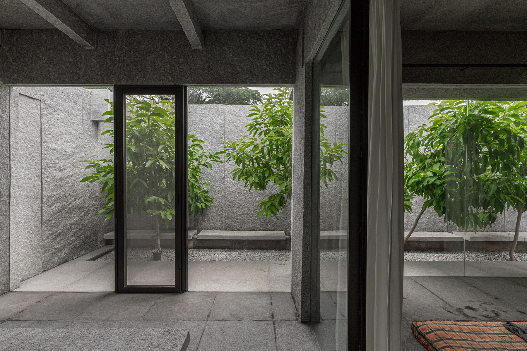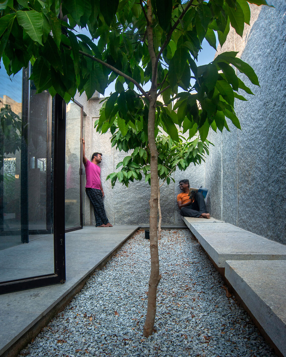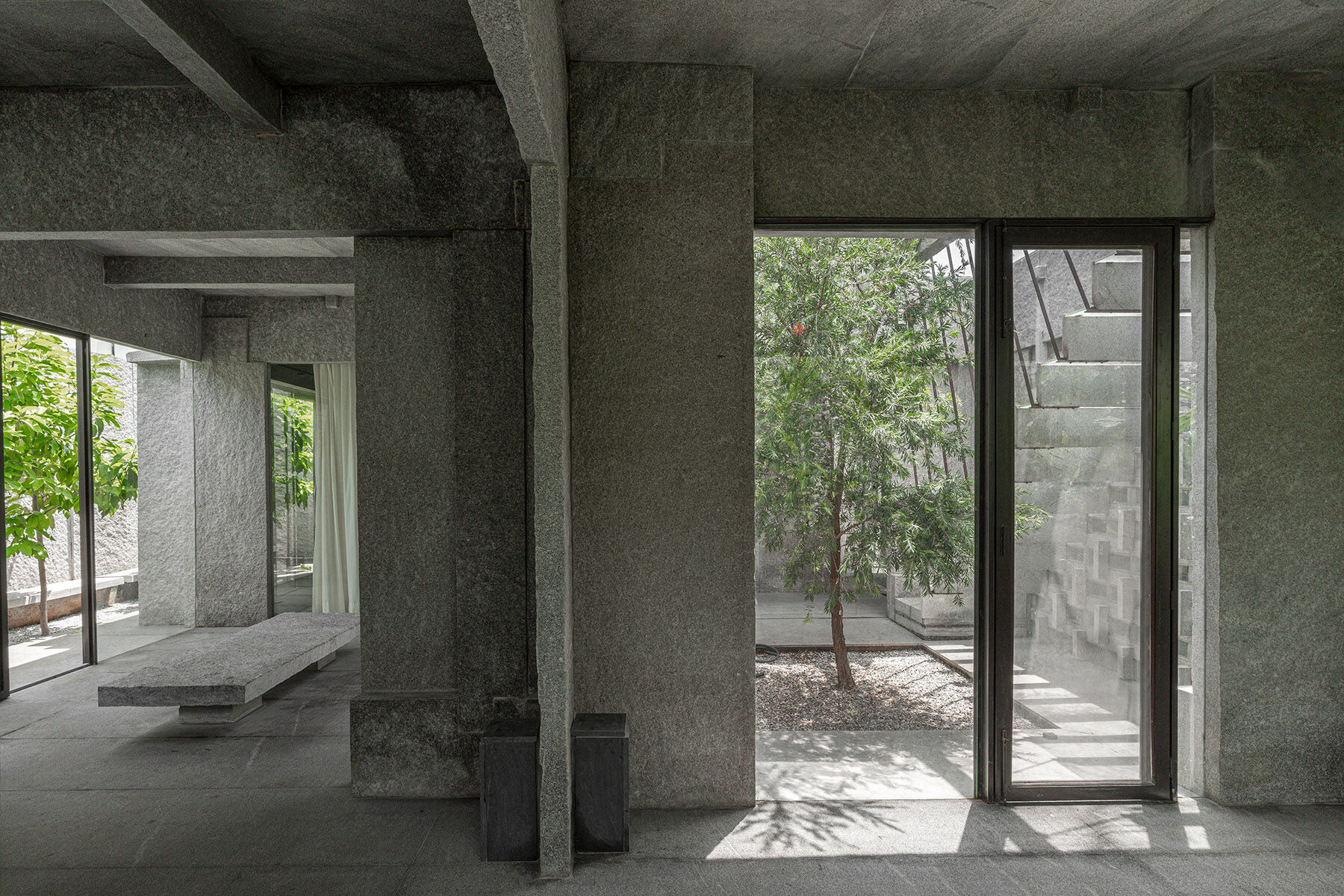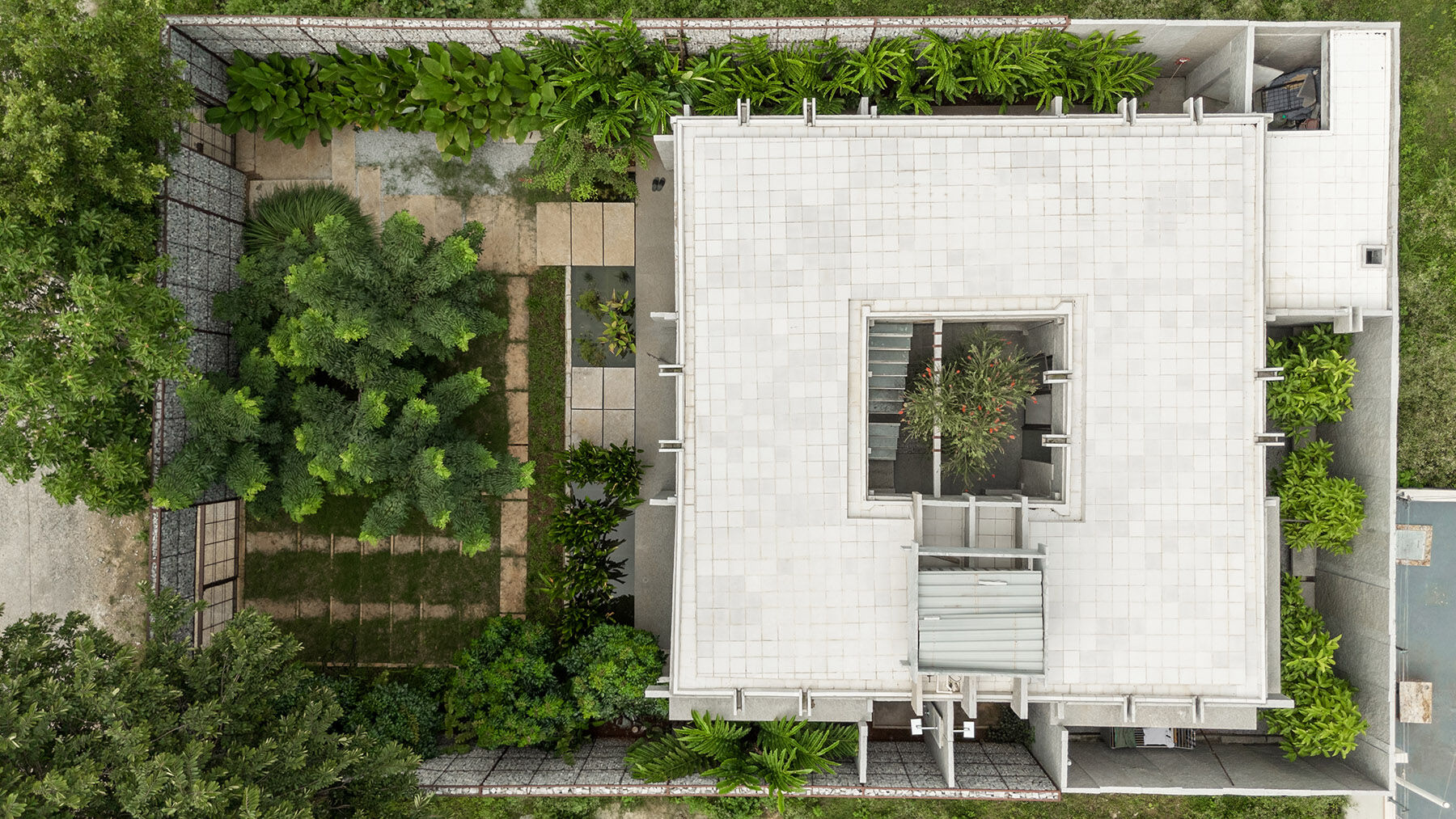 Một công trình nhà ở hoàn thành 2025, khai thác ánh sáng và gió tự nhiên, tổ chức không gian theo “lớp đệm” để giảm tải giải nhiệt cơ học. Dự án cũng cho thấy cách tận dụng các khoảng trống, giếng trời để đưa cây canh – thông gió và sâu trong lõi nhà.