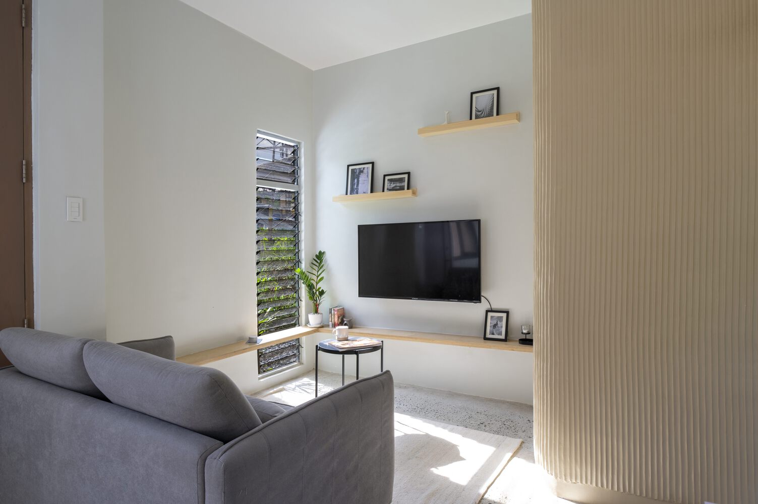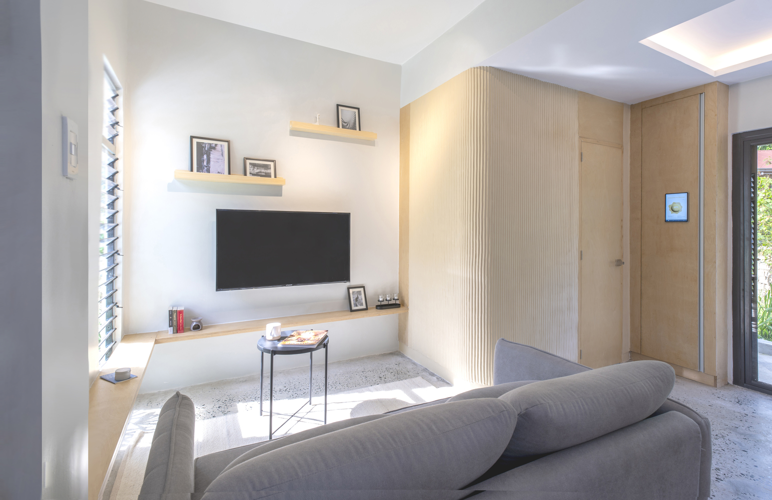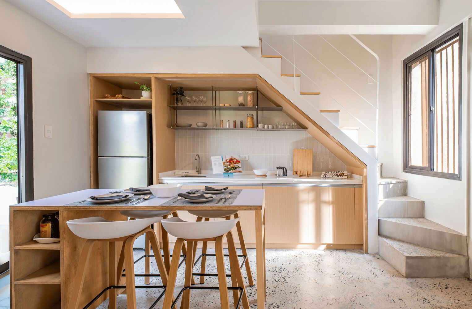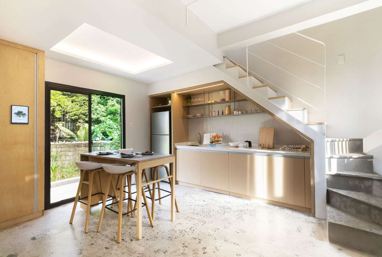 Một công trình nhà ở hoàn thành 2025, khai thác ánh sáng và gió tự nhiên, tổ chức không gian theo “lớp đệm” để giảm tải giải nhiệt cơ học. Dự án cũng cho thấy cách tận dụng các khoảng trống, giếng trời để đưa cây canh – thông gió và sâu trong lõi nhà.